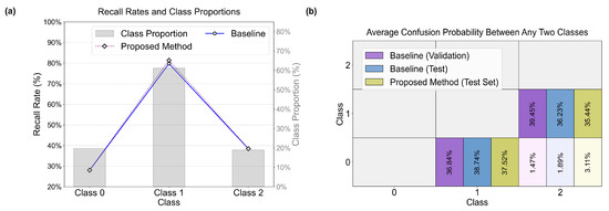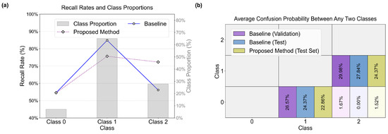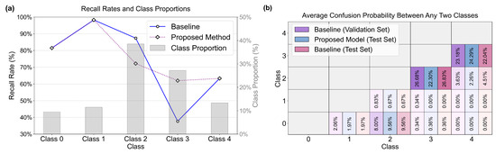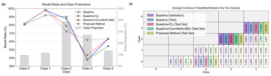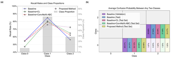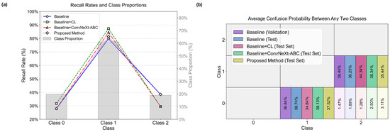 As listed in Table 2, the baseline model used the ConvNeXt model’s ConvNeXt-XLarge configuration. In the FBP task on the LSAFBD dataset, the proposed method outperformed all 18 comparative models in terms of ACC, MPR, MR, and MF1 and achieved the best performance. Specifically, the proposed method achieved an ACC of 72.09%, an MPR of 75.24%, an MR of 75.43%, and an MF1 of 75.28%—which are improvements of 0.74%, 0.84%, 1.79%, and 2.03%, respectively, over the baseline’s corresponding metrics of 71.35%, 74.40%, 73.64%, and 73.25%. As shown in Figure 3, in the analysis of the average misclassification probability for any two classes, the baseline ConvNeXt-XLarge model exhibited the highest probability of 26.68% for classes 2 and 3 on the validation set. In contrast, the proposed method achieved recall rates of 72.17% and 61.95% for classes 2 and 3, respectively, the sum of which surpassed that of the baseline’s 87.39% and 37.68%. Additionally, the proposed method reduced the average misclassification probability to 22.30%, a reduction of 0.15% compared to the baseline’s 26.83%.
