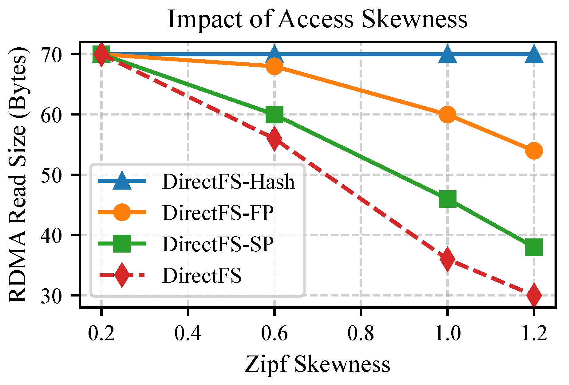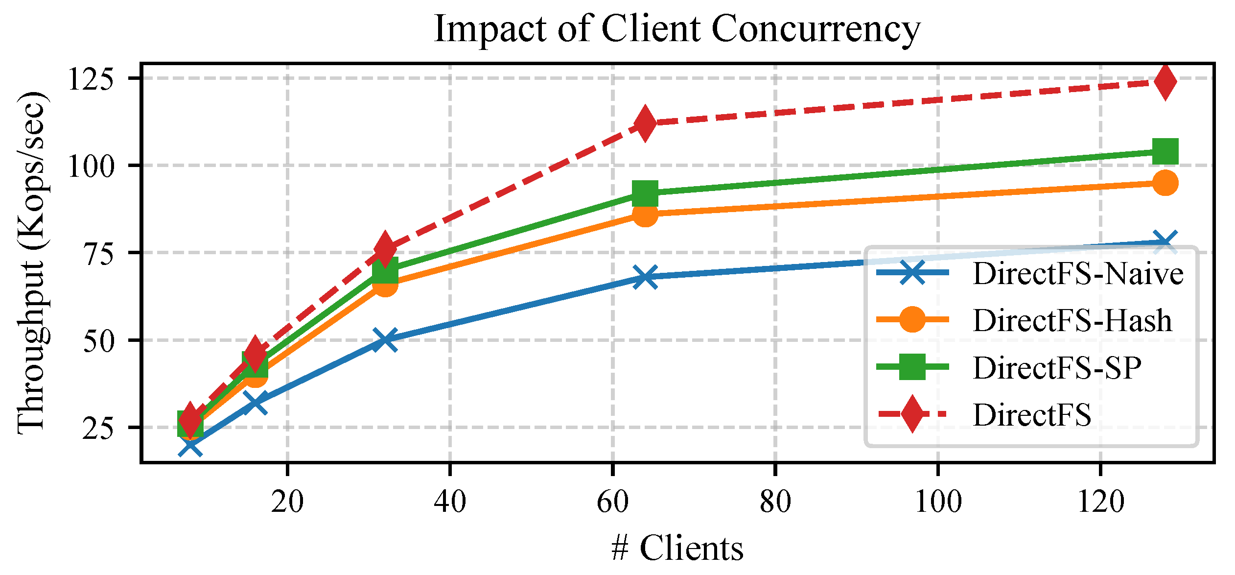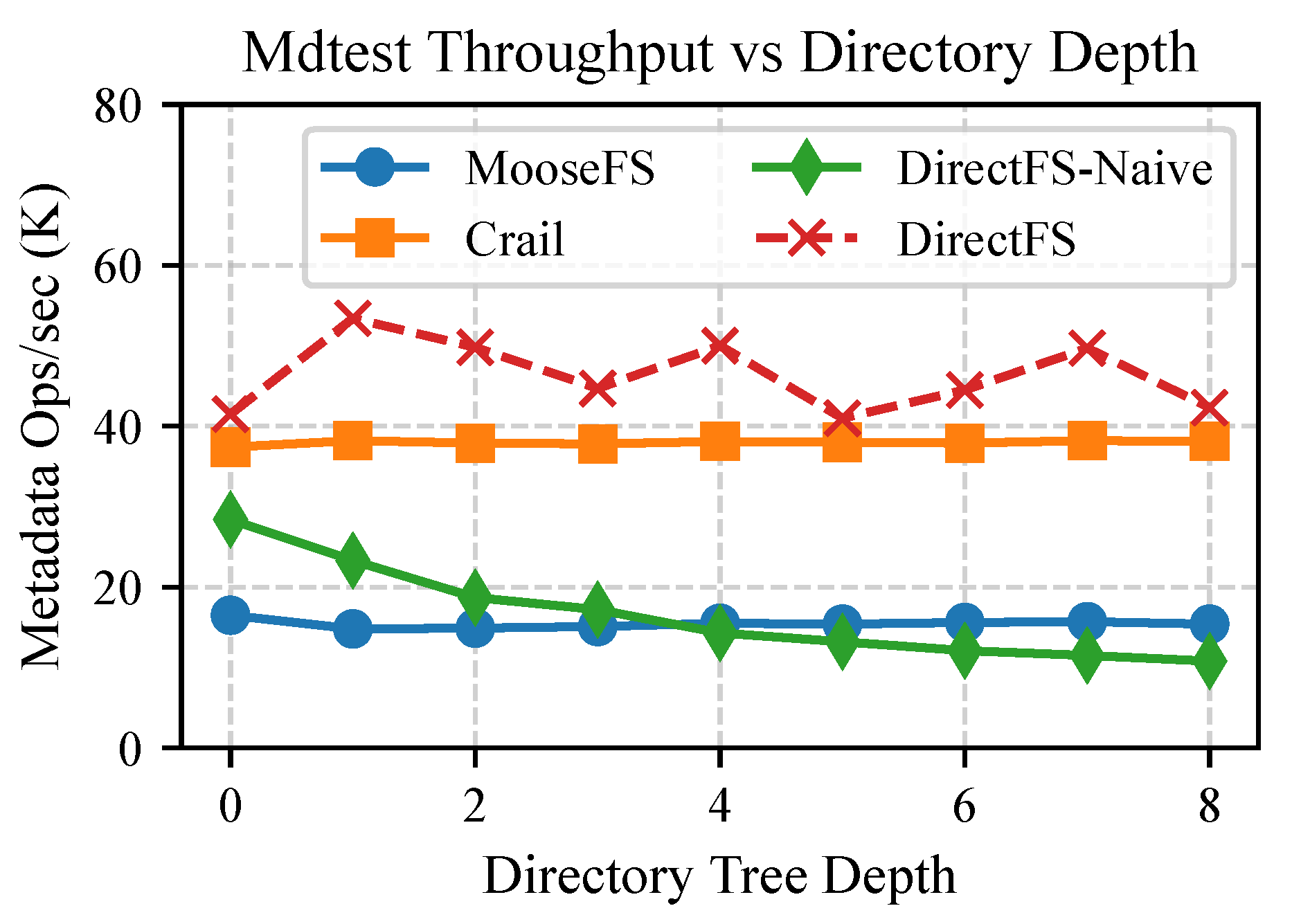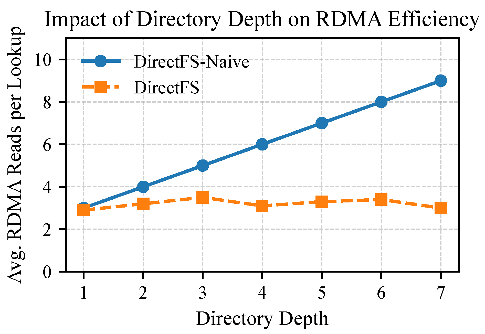 - DirectFS-Naive: A simplified variant of DirectFS that supports metadata access via one-sided RDMA but lacks full-path indexing and prefetching optimizations. Clients resolve pathnames by traversing the directory tree level by level and issuing one RDMA read per component.