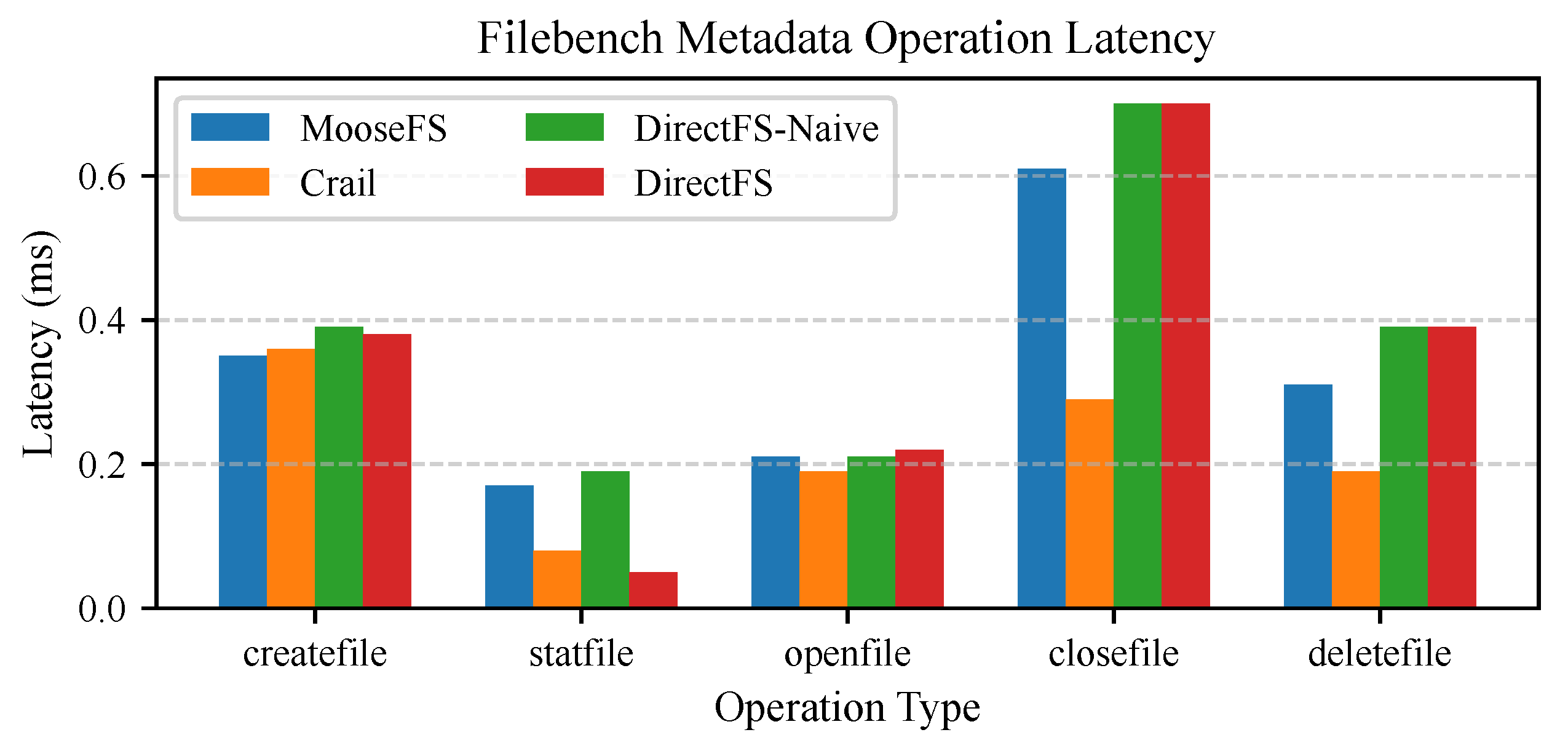 - MooseFS [27]: The baseline distributed file system where clients communicate with the metadata server via TCP. The server performs metadata operations in DRAM and returns results over the network.