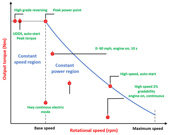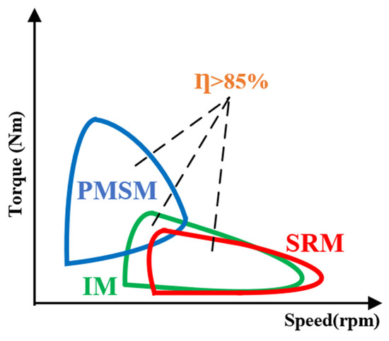 It has become evident to EV producers that the PMSM is the optimal choice due to its high efficiency, greater power density, and robustness. Since more current is required at the field-weakening process for high speeds, PMSM is often a solid option for civic driving in terms of efficiency. Different zones for qualitative efficiency in constant power and constant torque of various machines are depicted in Figure 2 [2]. The parameters were given numerical numbers by the authors in [4], who also divided them into low, medium, and high ranges.