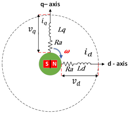 Vector Control (VC), also called Field-Oriented Control (FOC), is a popular high-performance control method that the PMSM uses in the closed-loop speed control mode. This technology controls PMSM and AC induction machines, giving them amazing capability control at full speed and torque limits. The basic idea of Vector Control (VC) is to divide the stator current vector into two parts: the torque current, which generates the mechanical force, and the magnetized current, which generates the magnetic field. The best motor control performance can be obtained by regulating the phase and amplitude of these two currents. In order to execute Vector Control, the stator current must be transformed from the steady reference frame to the rotor flux reference, or d-q reference frame. Figure 3 displays the d-q mathematical model of PMSM, as in [2]. denotes the equivalent resistance of the single winding in this figure; the equivalent voltages in the d-axis and the q-axis are represented by ; the equivalent currents in the d-axis and the q-axis are represented by and ; and the equivalent inductances in the d-axis and q-axis are represented by and . The voltages in this coordinate system are given by the following formula [2]:
