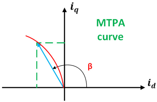 Therefore, it is crucial to have detailed control techniques that aim to use the twofold torque era mechanism in the most environmentally friendly way possible. Maximum Torque per Ampere (MTPA), which is sometimes used as a synonym for optimal performance or efficiency, is the term used to describe those tactics. Put another way, it is one of the fundamental ideas that the machine working at such setpoints ensures improved efficiency, reduced copper loss in the stator windings, and maximum torque generation with the least current consumption. It is important to note that these MTPA tactics are occasionally called maximum torque per current (MTPC). A d-q current reference frame guarantees that the stator current is used as little as possible to generate the most excellent torque. By decreasing the current force with torque or maximizing torque concerning the limited current, we can reach the MTPA region or condition. Torque generation has a degree of freedom by the pair of and , which can be used to reduce energy consumption. It is essential to consider how the current angle in the d-q plane changes regarding the torque generated. This is known as the MTPA angle, as shown in Figure 5, and the current phase angle β is represented by the current vector in polar coordinates [2].