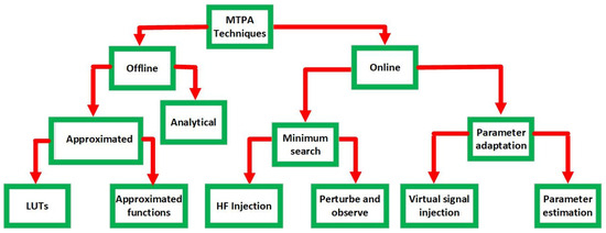 As shown in Figure 6, MTPA strategies can be divided into online and offline approaches. From this perspective, it is crucial to pay attention to how the MTPA depends on the machine’s settings [2]. A general diagram of electric drives using MTPA techniques is shown in Figure 7. On the one hand, there are several ways to implement MTPA as an online method, including processing the output of the regulated speed concerning a set of current and torque control loop references such as (FOC) and (DTC). Conversely, some offline MTPA methods are represented by Look-Up Tables (LUT) and analytical solutions [2,64,65].