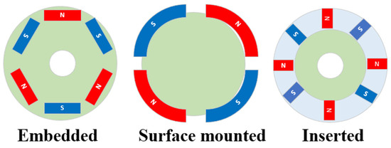 PMSMs are classified into two categories based on where the magnets are located on the rotor: interior permanent magnet synchronous machines (IPMSMs) and surface-mounted permanent magnet synchronous machines (SPMSMs). The permanent magnet is positioned on the rotor’s surface in the SPMSM, but it is buried deep within the rotor in the IPMSM [19,53,66]. This feature sets PMSMs apart because the placement of the permanent magnets provides greater protection against centrifugal forces, resulting in a robust construction. Various PMSM rotor machine types are depicted in Figure 8 based on the magnet positions. Furthermore, in the SPMSM, the reluctance torque is nearly zero due to the inductances and being roughly identical due to permanent magnets confronting the stator armature windings and air gap. On the other hand, the IPMSM’s total torque is made up of the reluctance torque and the load torque generated by the permanent magnet flux. The IPMSM’s mechanical structure contains a non-uniform gap that causes the inductances and to be unequal, a phenomenon known as cross magnetization. As a result, there is a high reluctance route because of the flux along the d-axis instead of the q-axis. This fluctuation in reluctance creates magnetic saliency, producing a reluctance torque. In terms of torque capability output, all these favor IPMSMs over SPMSMs [2,63,67,68,69,70].
