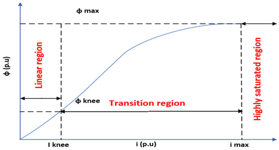 Put simply, the ferromagnetic core materials used in electric machines have a unique property that can become saturated as the flux passing through the core increases. In other words, when the overall flux, which depends on rotor and stator currents, increases in the electric machine, these ferromagnetic parts will reach a saturation point. This saturation effect occurs when the induced current increase does not proportionally increase the strength of the magnetic field [74]. This magnetic saturation effect is caused by inequality in inductances and in the IPMSM, known as (cross magnetization) and leads to a high nonlinear relationship between an inductor’s current and flux linkage [69]. This nonlinear inductor’s characteristic is divided into three regions, as shown in Figure 9 [2].