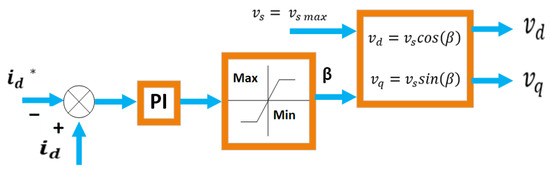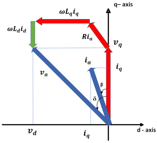 The permanent magnet synchronous machine’s phasor diagram, which is obtained from Equation (1), is depicted in Figure 10, where represents the current vector and represents the voltage vector [2]. The figure also shows the positive d-axis’s voltage angle δ and current angle (β). Several PMSM control methods based on the variables , , and β have been documented in the literature [77].