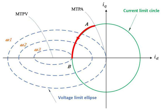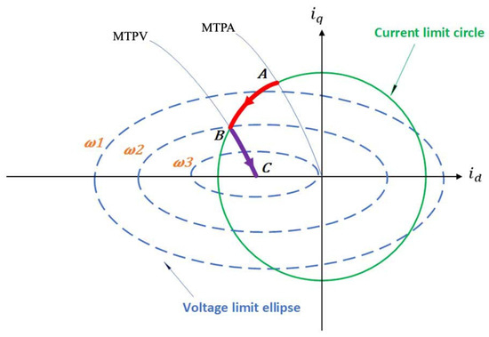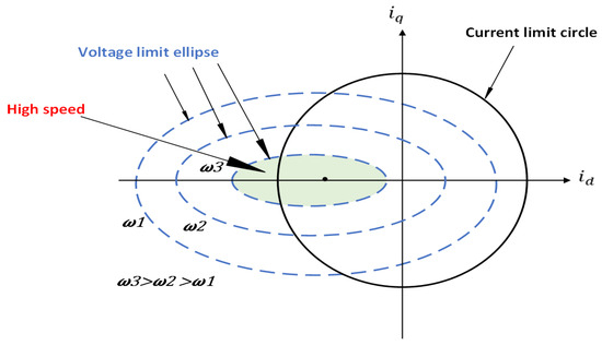 These synchronous machines must be controlled to satisfy the constraints simultaneously within the voltage ellipse and current circumference [79]. In addition, the current limits, as stated in (7), result in a curve that includes a circumference in the d-q plane of stator currents with a radius . Similarly, an ellipse with a reduced radius exists for the voltage limit Formula (10) when the electric machine’s speed increases. Current and voltage limits in the d-q current plane are shown in Figure 11 below [2].