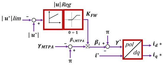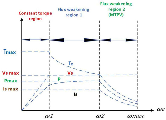 - Sepulchre, L.; Fadel, M.; Ptetrzak-David, M. MTPV for Continuous Flux-Weakening Strategy Control Law for IPMSM. In Proceedings of the 2018 International Symposium on Power Electronics, Electrical Drives, Automation and Motion (SPEEDAM), Amalfi, Italy, 20–22 June 2018; pp. 1221–1226. [Google Scholar] [CrossRef]