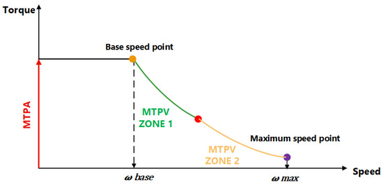 Since PMSMs have a constant rotor flux, the flux of the stator can be weakened by delivering a demagnetizing current alongside the d-axis. This is necessary for high-speed operation in AC machines, which requires the right weakening for the flux. The optimal approach involves selecting the appropriate controlled vectors to maximize output torque while minaimizing stator flux. Maximum torque per volt (MTPV) is a control approach used in high-speed situations. It is complex to properly select all limitations and constraints, including current and voltage vectors [50,51,52,71,72,73].