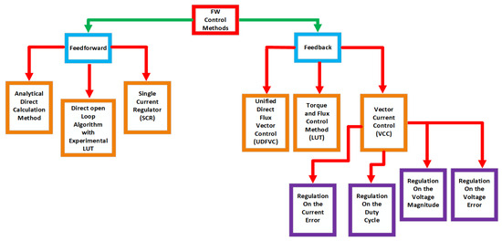 This manuscript begins with a discussion of common control strategies of PMSMs in Section 2; in Section 3, a detailed description of the Maximum Torque per Ampere (MTPA) operating region in PMSMs is presented. Section 4 provides an overview and working elements of the FW strategy. In Section 5, a classification and analysis of various FW control methods are presented. In Section 6, there is a discussion on the main advantages and disadvantages of the reviewed FW strategies and their suitability for different machine types, summarizing key insights in a comparative table. Finally, Section 7 draws the major conclusions and outlines future research directions.