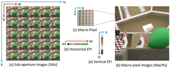 The light field captures light rays originating from different positions and directions in space, and can be represented as a four-dimensional function , where denote the angular dimensions corresponding to the incident direction or views of the light rays, and denote the spatial dimensions representing the position of the light rays in space. For more intuitive visualization, the light field image is often rearranged into sub-aperture images, which consist of images of size arranged along the angular dimensions, Each sub-aperture image is denoted as , as shown in Figure 2. The macro-pixel image (MacPI) rearranges the angular and spatial dimensions of the light field in an interleaved manner, resulting in a large 2D image that preserves both spatial and angular information. The epipolar plane image, on the other hand, represents a slice of the light field showing how pixels vary across viewpoints; its linear patterns reflect the continuity of the scene and can be used to detect object edges, texture information, or estimate depth. Adjusting the luminance and structural details of the light field in the frequency domain can further enhance the enhancement performance.