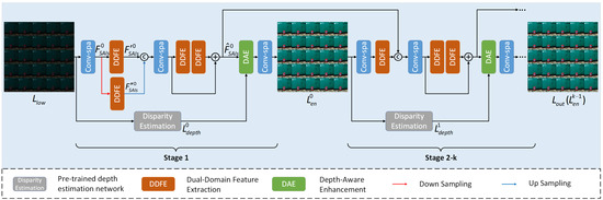 The overall architecture of DDPNet is illustrated in Figure 3. This method adopts a depth-guided dual-domain progressive restoration strategy to gradually enhance low-light LF images. In the initial stage, spatical dimension convolutional operations are first applied to the input low-light SAIs to extract high-dimensional features: