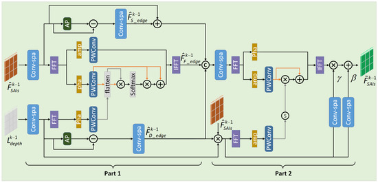 where, denotes the phase attention map, is the phase component of the low-light feature map, represents the phase of the depth feature map, and is the enhanced phase map. Next, we concatenate and fuse the low-light feature map , the edge features of the low-light image , the edge features of the depth map and edge-enhanced features in the frequency domain to obtain the edge-enhanced feature map.