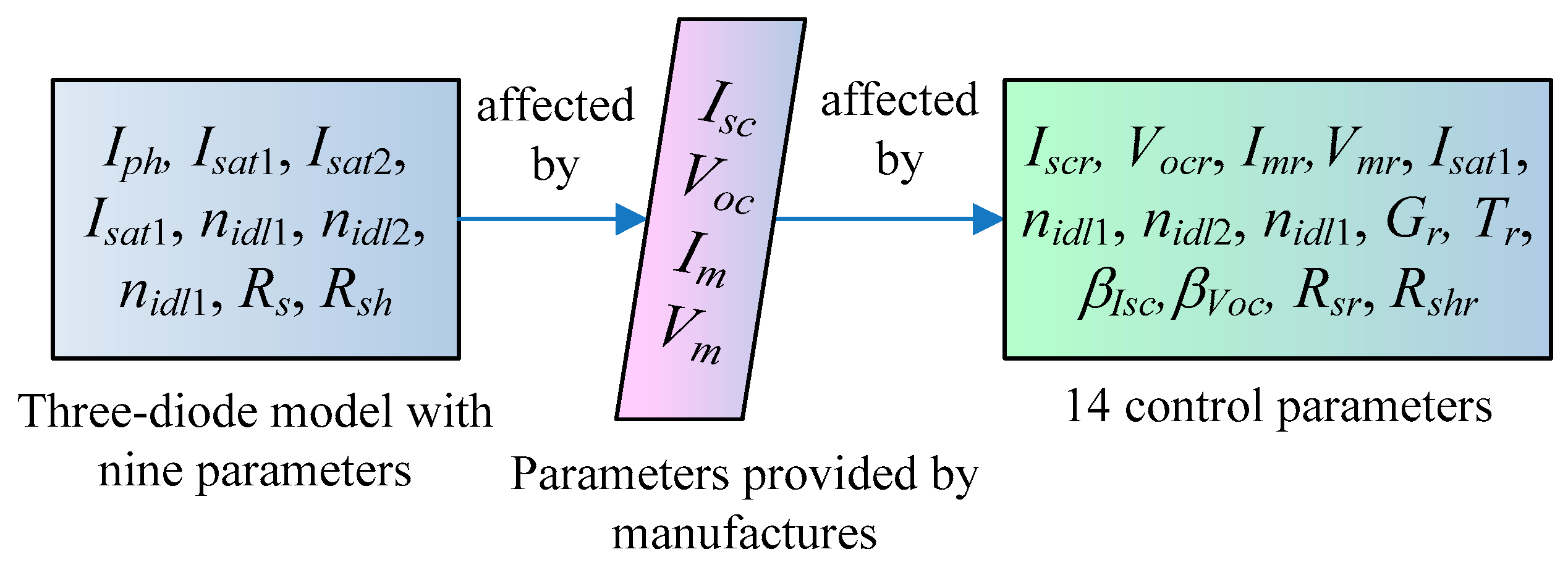 | Irradiance under STC, Gr (W/m2) | 1000~1050 | Ideality factor (3rd diode), nidl3 | 1.2~3.0 |