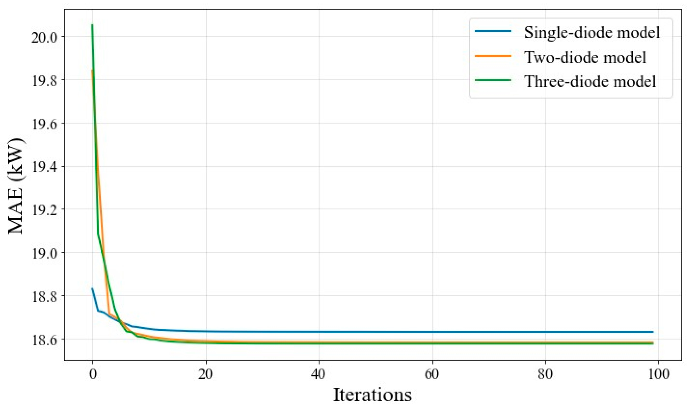 - The three-diode model provides superior estimation accuracy compared with the single- and two-diode models, albeit with a longer computation time (~12 min). Nevertheless, this additional computational burden does not hinder its applicability for fault detection in PV systems.