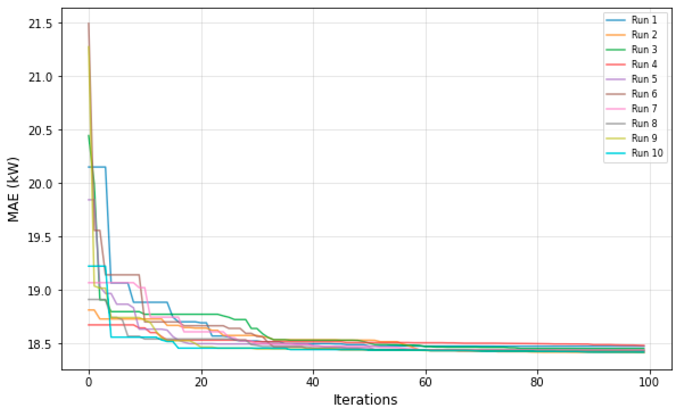- The proposed CNN–LSTM ensemble method consistently achieves stable performance and yields lower MRE compared with standalone LSTM and other individual optimization algorithms (Table 7). Although the difference in mean MRE between CNN–LSTM (3.968%) and the best individual method PSO (3.976%) is relatively small (0.008 p.p.), this improvement translates into meaningful gains in energy prediction accuracy when applied to a 733 kW PV system. In practical deployment, it corresponds to approximately 146.6 kWh annually (based on 2500 h per year).