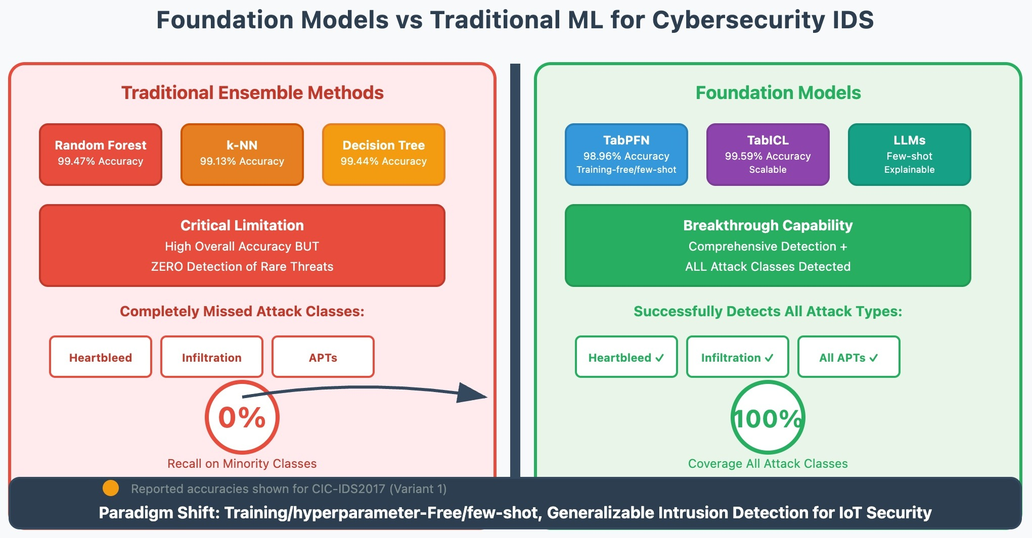 4. Exposure of Critical Limitation in Traditional Methods: We reveal that ensemble methods achieving >99% overall accuracy completely fail to detect minority attack classes, exposing a dangerous vulnerability that foundation models uniquely address through comprehensive threat detection capabilities.