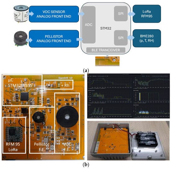 For methane detection, a MEMS-based pellistor (MP7227-DA, SGX Sensortech) is adopted. This device employs micromachined diaphragms with integrated catalytic and inert resistive elements. Compared to conventional pellistors, it offers faster warm-up times (~300 ms vs. 15 s) and reduced energy consumption. The node supports data transmission via both BLE and LoRa, enabling integration into distributed monitoring systems. At its core is the STM32WB55 microcontroller (STMicroelectronics, Plan-les-Ouates, Switzerland), a low-power unit with embedded BLE capabilities. The board integrates analog front-end circuits for both the VOC and methane sensors, alongside peripherals for humidity and temperature sensing (BME280, Bosch, Gerlingen, Germany) and LoRa communication through an RFM95 transceiver. Data can be transmitted via BLE advertising packets or LoRa messages to a remote gateway.