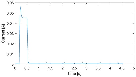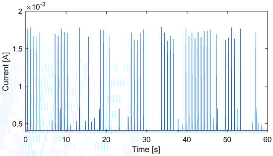 As already mentioned, the power consumption analysis was conducted by considering the three possible operating modes: idle, explosive gas monitoring and LoRa transmission modes. Measurements have been taken to assess the current drawn by the node when supplied with 4.5 V, simulating the conditions of alkaline battery power. The current consumption of the node was measured using a Keithley (Cleveland, OH, USA) DMM7510 digital multimeter connected in series between the laboratory power supply emulating the battery (TTi EL302T, Huntingdon, UK) and the power input of the sensor node, i.e., before the linear regulator that powers the board. This configuration allows accurate monitoring of the total current profile of the device. The DMM7510 was selected because it supports acquisition up to 1 MS/s at 18-bit resolution and is specifically designed for low-power device characterization, including accurate measurement of sleep-mode consumption through its lower range of 10 μA and its autoranging capability.