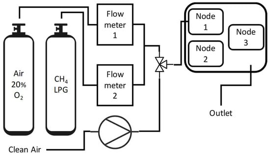 The test bench was designed not only to deliver traceable concentrations of methane and LPG but also to allow the simultaneous evaluation of three nodes. To this end, a large-volume chamber was used, in which gas was purged by a diaphragm pump and uniformly distributed by an internal ventilation system. This configuration reduced stabilization times and ensured homogeneous exposure conditions, improving reproducibility across repeated measurements.