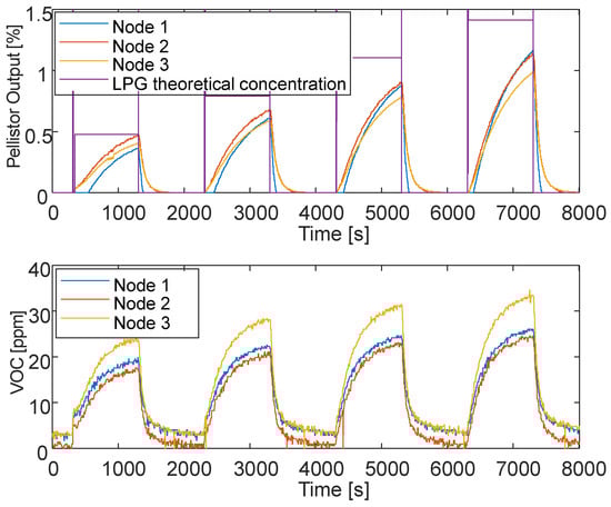 Subsequently, the response to LPG mixtures was analyzed to characterize the efficacy of the VOC “sentinel” strategy. Three nodes were tested by injecting into the measurement chamber a flow of synthetic air (500 mL/min) with four different percentages of gas from the LPG cylinder. Specifically, the tests involved a cycle of four phases with increasing LPG concentrations (0.47%, 0.79%, 1.10%, 1.41%), each followed by a chamber cleaning phase. While the calibration curves described in Equation (1) and Table 3 were used for the pellistor outputs, the electrochemical VOC sensors were evaluated using the factory calibration coefficients.