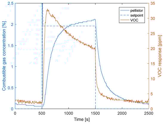 The dynamic behavior of the sensors in a smaller, faster chamber is shown in Figure 6, where it can be seen that the response time of the VOC sensor is actually much shorter than that of the pellistor (less than one minute for a 10–90% step). Therefore, the dynamics of the VOC sensor are not the limiting factor for the promptness of the alarm system.