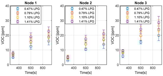 Figure 7 shows the measurements obtained with the VOC sensor, for each gas phase, 300 s, 600 s, and 900 s after the beginning of the LPG injection, reported as mean ± standard deviation. Table 4 shows the repeatability analysis for the VOC sensors output at the end of each gas injection; it can be seen that the behavior of the three sensors is very similar, and the relative standard deviation is lower than 5 ppm.