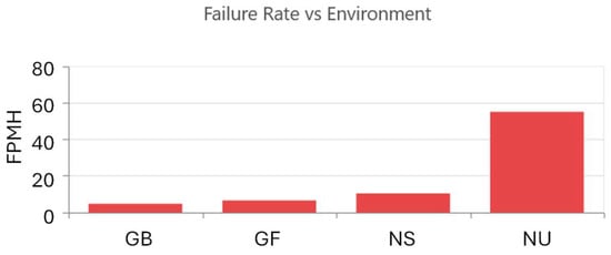 Although the proposed sensor node has been designed to operate in GF environments, the reliability study was also extended to Ground Benign (GB), Naval Sheltered (NS), and Naval Unsheltered (NU) environments. This was done because the metrological characteristics of the proposed sensor node are also suitable for monitoring gas leaks in industrial contexts, where it is not always possible to install measurement systems in GF conditions. The outcomes, expressed in failures per million hours (FPMH), are presented in Figure 8. This behavior is not affected by the choice of database and is therefore valid for both datasets considered.