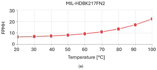 To evaluate the performance with respect to temperature dependence, Figure 9a shows the FPMH predicted using the MIL-HDBK-217F Notice 2 standard. It can be observed that the process rate (PR) governing component aging follows Equation (2) where A is a geometric constant, Ea is the average system activation energy, k is the Boltzmann constant, and T is the temperature expressed in Kelvin.