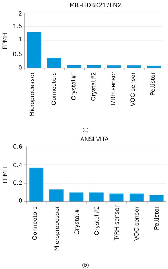The comparison between MIL-HDBK-217F Notice 2 and ANSI/VITA 51.1 highlights how the two standards classify critical components differently. In the conservative MIL-217F-N2 model the microprocessor dominates the overall failure rate, while in the ANSI/VITA 51.1 database the connectors emerge as the primary contributors. This shift reflects the fact that MIL-217F penalizes modern integrated devices such as microcontrollers, whereas ANSI/VITA 51.1 incorporates updated reliability data and field-return statistics, yielding more realistic estimates. In our case, given the adoption of state-of-the-art microcontrollers with integrated wireless functionality, the ANSI/VITA 51.1 results are likely more representative of actual field performance.