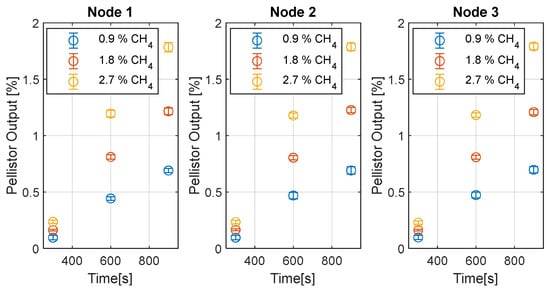 Figure 11 shows the baseline methane measurement results, recorded prior to any temperature treatment and after pellistor calibration. Cycles with increasing methane concentrations were repeated 10 times. Each cycle consisted of three phases with methane concentrations of 0.9%, 1.8%, and 2.7%, each lasting 1000 s and separated by chamber cleaning phases. For each phase, the concentration values measured 300 s, 600 s, and 900 s after the beginning of the methane injection are reported as mean ± standard deviation.
