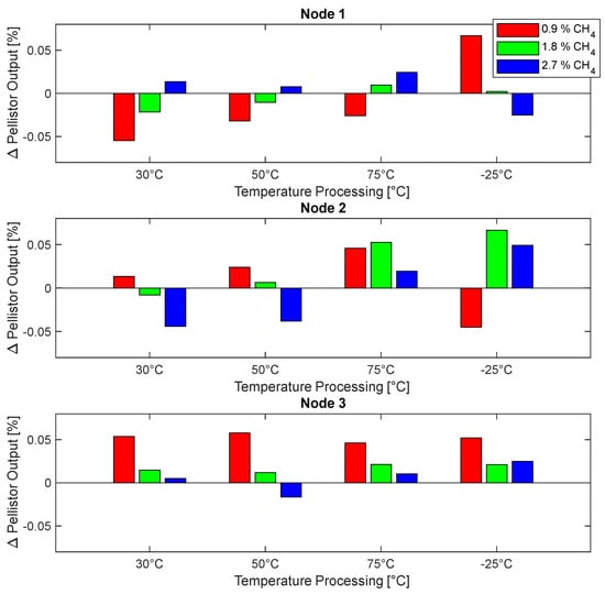 Figure 12 shows the deviations in methane concentration measured after the different temperature treatments, expressed with respect to the baseline values. In particular, each deviation was calculated as the difference between the concentration measured by the nodes 900 s after the start of gas injection and the corresponding baseline measurement. It can be observed that these deviations remain within the range of the standard deviations of the baseline measurements.