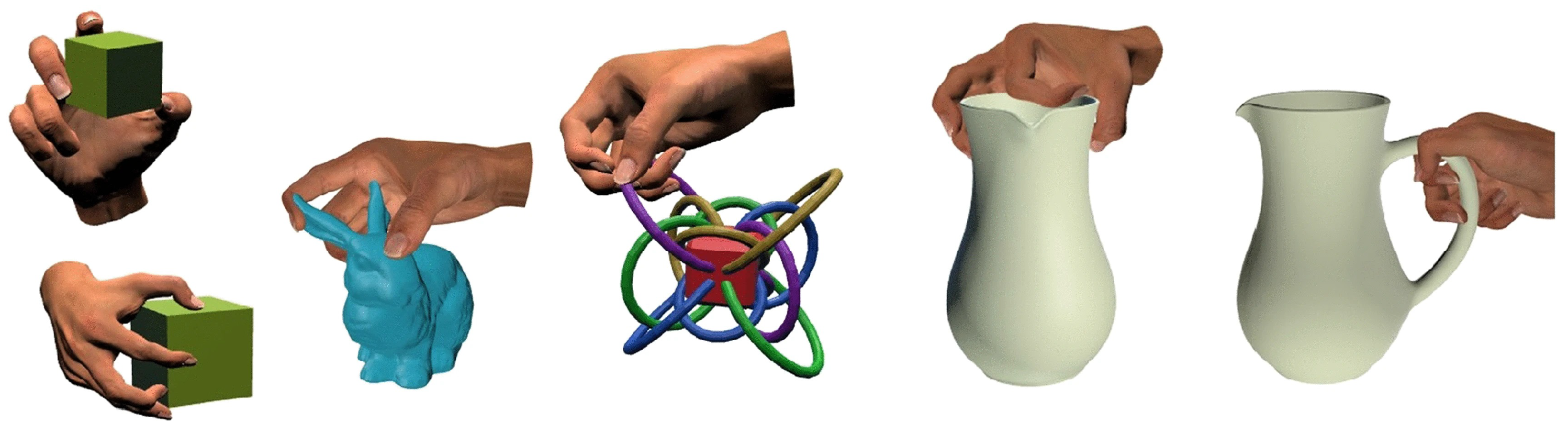 ObMan [68] | Synthetic | Eight object categories from ShapeNet (bottles, bowls, cans, jars, knives, cellphones, cameras, remote controls) | MANO hand model; object meshes; point clouds | Contact map derivation; SDF computation | No |