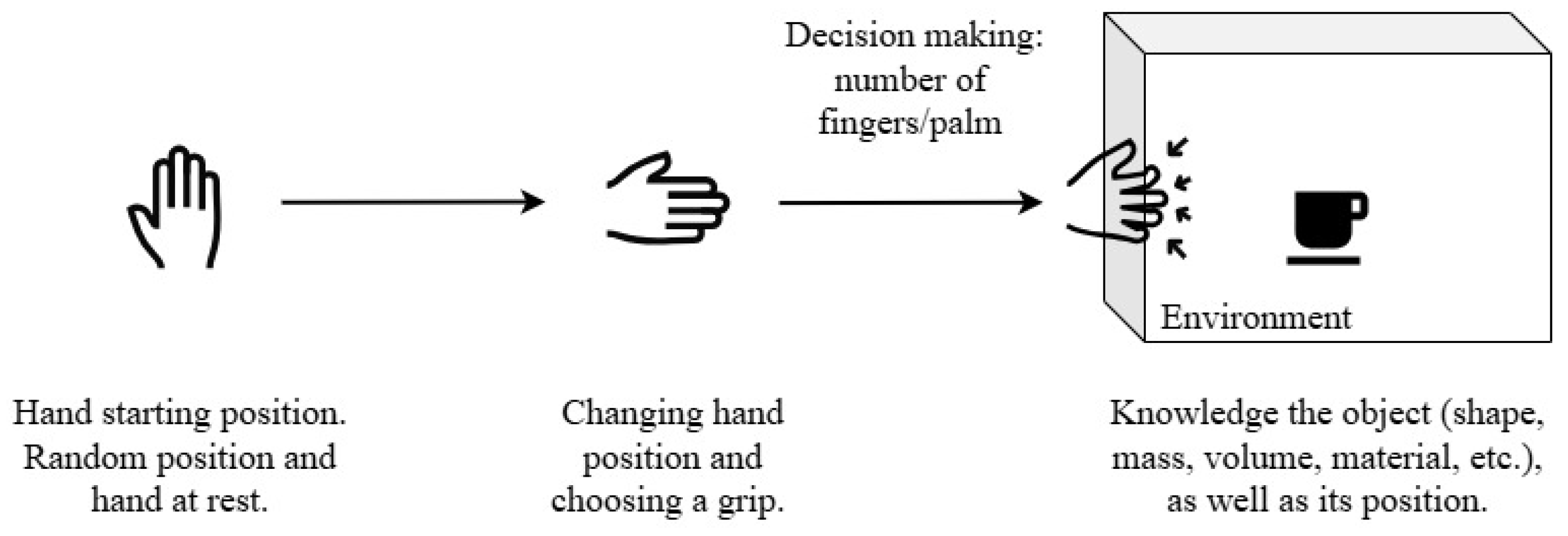 - A seven-step grasping framework: We propose a multi-layered grasping model that combines biomechanical, perceptual, physical, and contextual processes. Our framework differs from others because it combines the layers of object geometry and physics into a single sequence, making human–object interactions more realistic and adaptive.