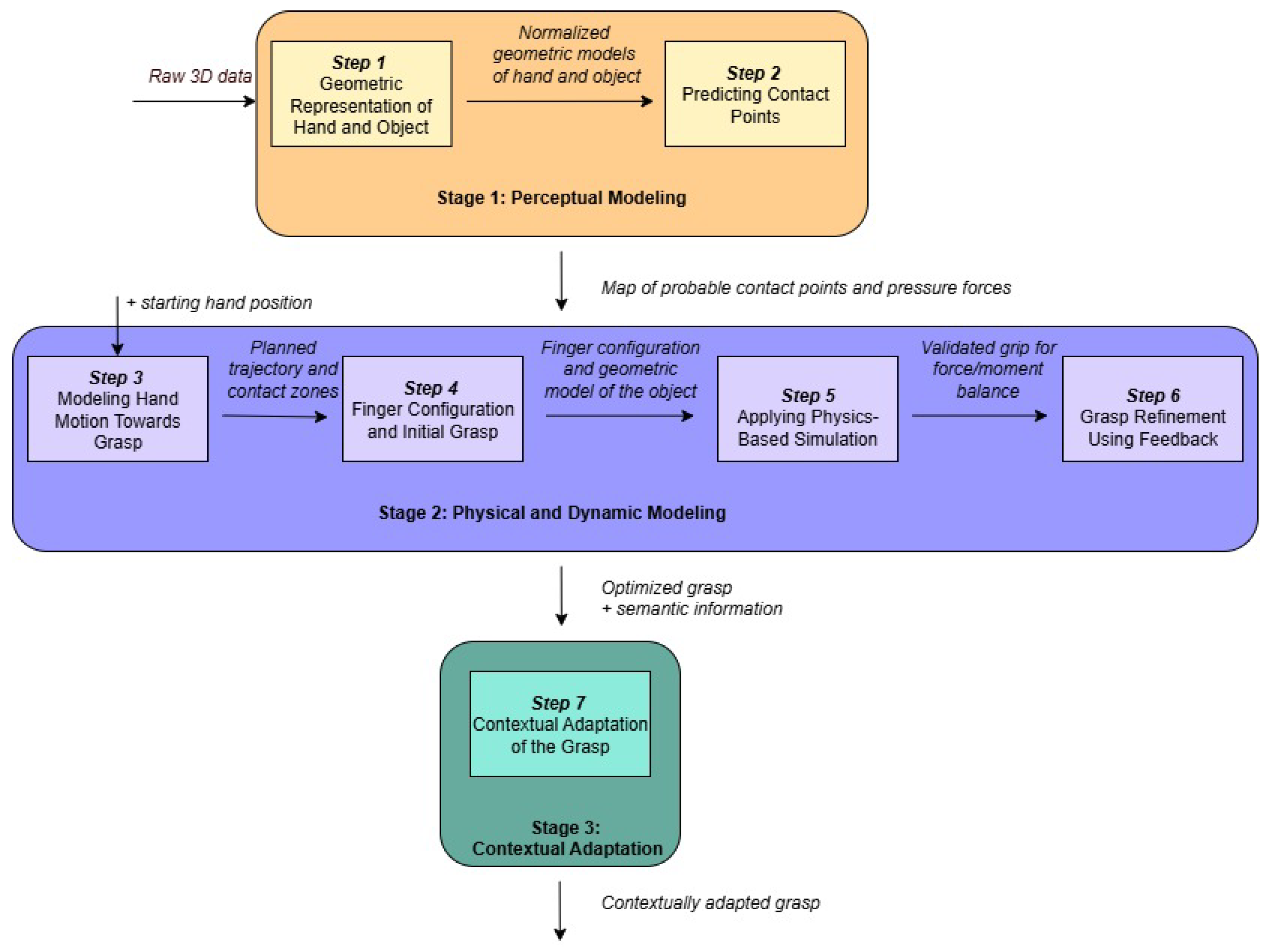 - Stage 1: Perceptual Modeling (Steps 1–2)—representation of the hand and the object and identification of contact candidates;