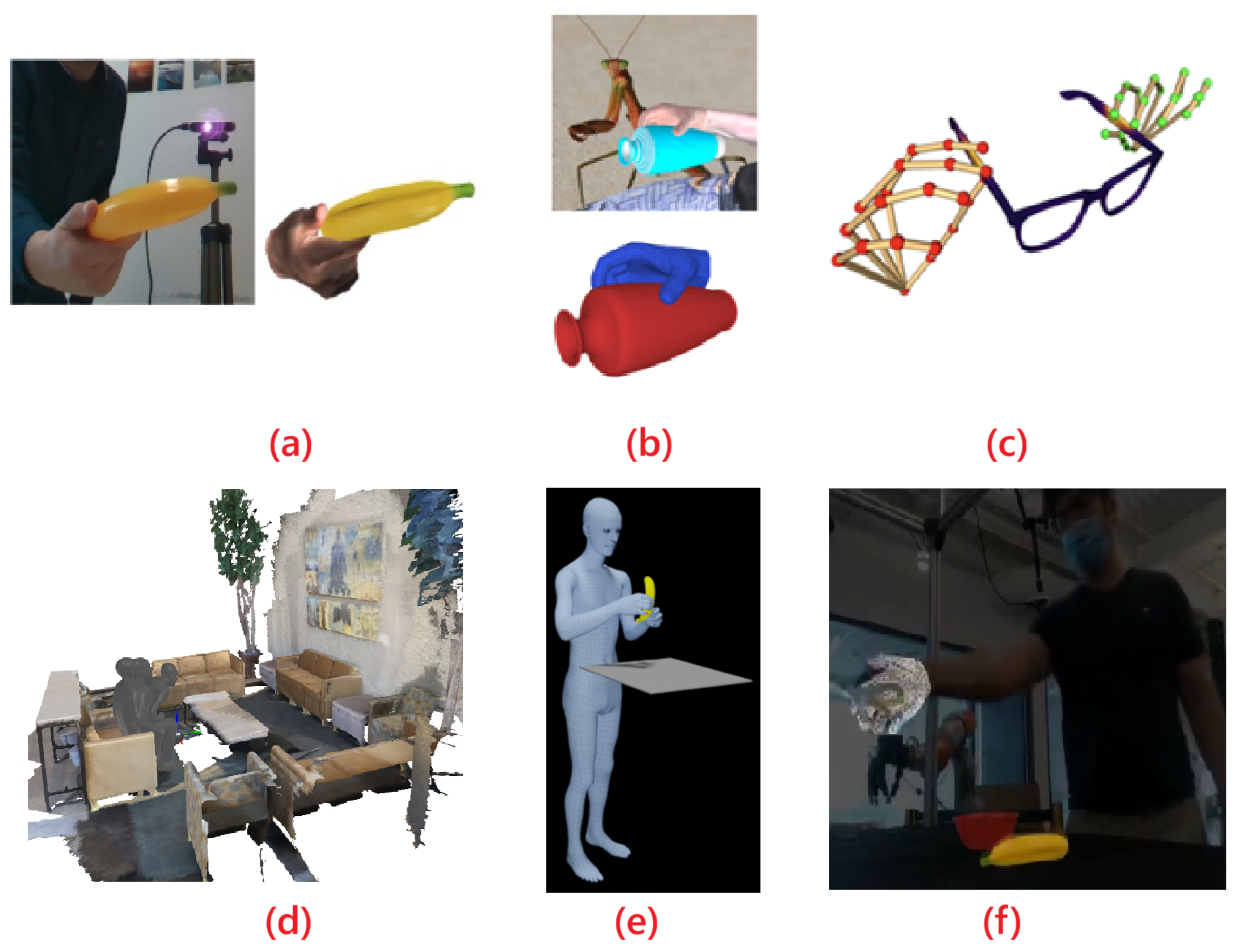 ContactPose [69] | Real | Glass, metal, plastic, etc. | Three-dimensional hand/object poses; high-resolution thermal-based contact maps; multi-view RGB-D images | Thermal data preprocessing; object surface extraction | No |