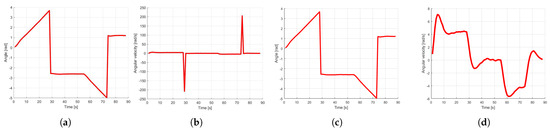 This vector represents the full state vector that will allow fine tracking of the obstacle’s dynamic state and will provide input for further calculations. For this application, UKF was modified compared with its basic form, which can be found in [20], because it caused problems when estimating orientation. Depending on how motion controllers are coded, orientation is expected to be limited to or range. In Figure 1a comparison can be seen between simply limiting orientation value and implementing additional logic within UKF to handle overflow case. It can be seen that if it is not properly addressed, UKF will treat it as a sudden change in the measured state, leading to errors in the following velocity and acceleration estimation.