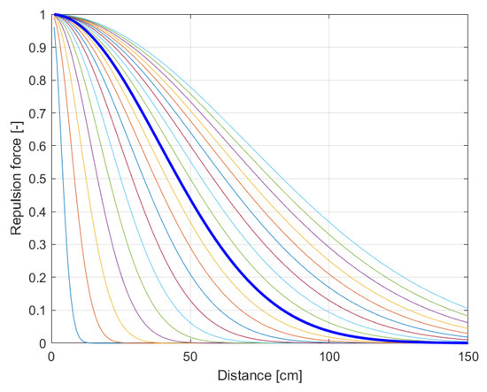 where is the repulsive force, calculated separately for each LiDAR measurement point, d is the distance from the detected point, and a is the angle to the detected point relative to the front of the robot. The Signum function is used to determine whether the robot should turn left or right to avoid an obstacle. The parameter in the denominator was chosen to be 55 based on experiments on the APF motion controller conducted in [22]. Presented function was checked for multiple values of the parameter to check how the curve would be changing, what can be seen in Figure 2. The value chosen reflects the limited dynamics of the simulated robot, which requires initiating avoidance maneuvers in advance.
