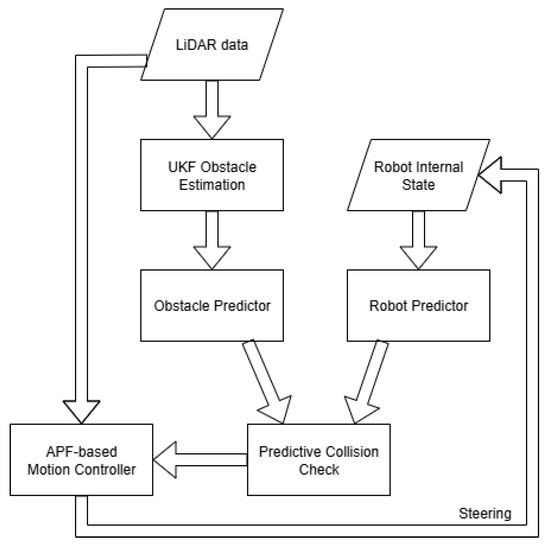 In the scope of this work, the APF algorithm is used as a motion controller that focuses on obstacle avoidance. The basic data input for the algorithm is feedback from the LiDAR scanning the robot’s immediate surroundings, as well as information about the robot’s localization and the current target, ensuring the robot will attempt to achieve its target. Apart from those calculations, the robot will perform the prediction of the obstacle trajectory in the immediate future based on the UKF estimation, so no communication with other agents is required.
