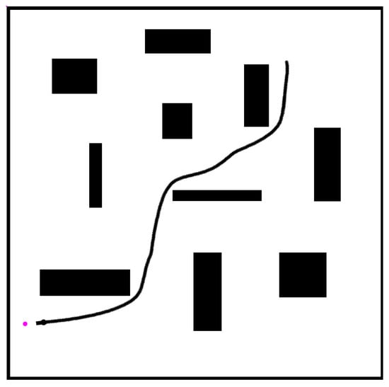 Initial verification of the presented approach was conducted to check if the APF motion controller algorithm works correctly. To ascertain it, a testing environment with static obstacles was prepared. As will be shown in later examples, using only the APF controller might cause problems when the robot finds itself in the immediate surroundings of a dynamic obstacle, which will be resolved through the use of the predictor algorithm. As seen in Figure 5, the robot successfully traversed the environment with static obstacles and reached its target.