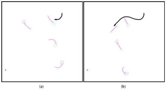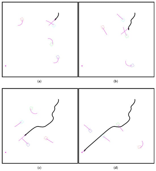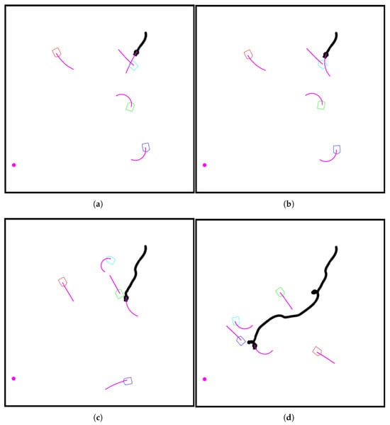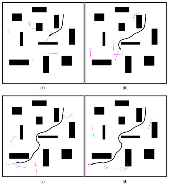 The effects of using the second approach can be seen in Figure 9. Figure 9a shows the moment before the robot starts the avoidance maneuver for the first obstacle. When comparing it with Figure 9b, which is before the second maneuver, it can be seen that while the distance from the obstacle in both cases is similar, the robot orientation has changed earlier in the second case. This is because in the first case, the moment presented is just after the obstacle finishes turning, and only now is on a collision course with the robot, thus the robot started avoidance movement later. Figure 9c can be used to compare avoidance radii-when a collision course was detected earlier, the robot naturally started maneuvering in advance. The same subfigure presents a moment when the predicted trajectories of the robot and the blue obstacle started overlapping. Figure 9d shows that despite it happening, the robot’s trajectory remained unchanged. This is because, as described before, the algorithm is analyzing predictions in a certain range, both physical and temporal. If trajectories are overlapping, but their distance on the time axis is big enough, both objects will not happen to be in each other’s close enough vicinity that would justify commencing a maneuver.