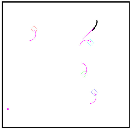 The next step of verification involved running the robot in a dynamic environment without the predictor part of the controller online. All obstacles present in the workspace are moving with constant velocity and have a constant turning rate, with magnitudes similar to those of the robot. The results can be seen in Figure 6. In the figure colored polygons denote dynamic obstacle and purple lines represents prediction of movement. The presented situation is an edge case that was specifically prepared to depict the main weakness of typical controllers working without a predictive component. When the robot and the obstacle met, they started following each other. While the obstacle was moving independently without any safety system maintaining distance from other obstacles (robots), the robot was trying to orient itself towards the target, while the safety system was ensuring that no collision would occur. The result is very specific and can be called another type of local minimum, but at the same time, it represents a situation that might occur when dealing with typical real mobile robots. Certainly, this sort of situation will not last indefinitely like an actual local minimum, but for a significant amount of time, the robot will be staying in a highly unpredictable state.