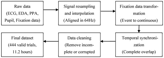 The original dataset employed heterogeneous sampling rates: ECG (130 Hz), PPG (64 Hz), pupil diameter (200 Hz), gaze (200 Hz), EDA (4 Hz), and fixations (event-based). To enable synchronized feature extraction, all continuous signals were resampled to a common rate of 64 Hz using linear interpolation. This frequency matches the native PPG sampling, represents a practical compromise between low-frequency EDA and high-frequency ocular streams, and remains sufficient to capture the dynamics of pupil and gaze measures (<30 Hz).