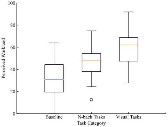 The NASA-TLX ratings were analyzed to validate the proposed label reassignment scheme using a repeated measures analysis of variance (ANOVA). Mauchly’s test of sphericity indicated that the sphericity assumption was violated (W = 0.274, p < 0.001). Therefore, Greenhouse–Geisser correction was applied to the degrees of freedom. The repeated measures ANOVA revealed a significant effect of task condition on perceived workload (F(2, 98) = 101.48, p < 0.001).
