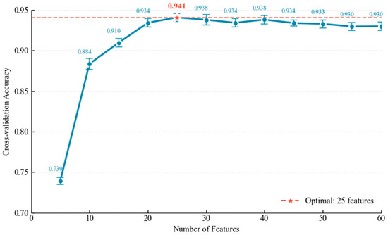 As shown in Figure 3, the best-performing subset contained 25 features, representing a 65.8% reduction relative to the original 73 while achieving the highest cross-validation accuracy. This optimized feature subset was therefore adopted in all subsequent experiments.