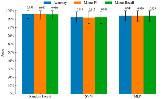 Before directly comparing within- and cross-subject protocols, a sensitivity analysis was first conducted under the cross-subject setting to examine robustness across temporal window configurations (Figure 6). Results showed that performance was relatively stable, with Accuracy and Macro-F1 ranging between 0.67 and 0.70. Among the tested settings, an 8 s window with 25% overlap achieved the highest performance, slightly outperforming 5 s windows with 50% overlap. Shorter 3 s windows consistently yielded lower results, suggesting that longer temporal coverage enhances cross-subject generalization. All subsequent analyses were therefore reported under the 8 s, 25% overlap configuration. Using this setting, Random Forest achieved Accuracy = 0.704 [0.666–0.741], Macro-F1 = 0.699 [0.664–0.735], and Macro-Recall = 0.695 [0.661–0.730] across subject-disjoint five-fold cross-validation. These results confirm that performance remains statistically stable across folds.