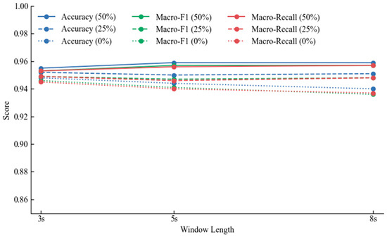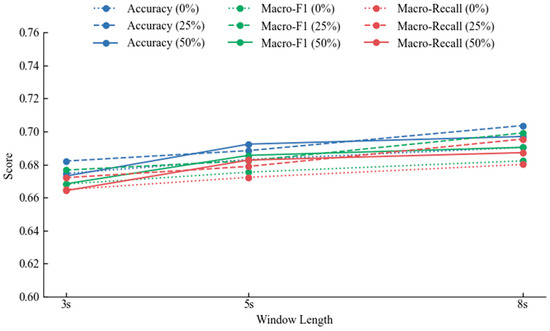 To investigate how temporal window configurations affect model performance, the window length (192, 320, and 512 samples, corresponding to 3.0 s, 5.0 s, and 8.0 s at 64 Hz) and the window overlap (50%, 25%, and 0%) were systematically varied. Figure 5 summarizes the results.