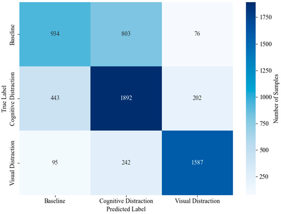 The confusion matrix (Figure 7) highlights the class-wise performance. Baseline states were the most difficult to classify, with recall ≈ 0.52 and frequent confusion with cognitive distraction. Cognitive distraction achieved moderate recall (≈0.75), though many instances were mislabeled as baseline. Visual distraction was most robust (recall ≈ 0.83), with relatively few misclassifications. Error taxonomy analysis suggested that baseline–cognitive confusion was often linked to transient arousal fluctuations (e.g., short EDA bursts) or noisy gaze tracking, while visual distraction errors were primarily due to eye-tracking artifacts (e.g., unstable pupil tracking).