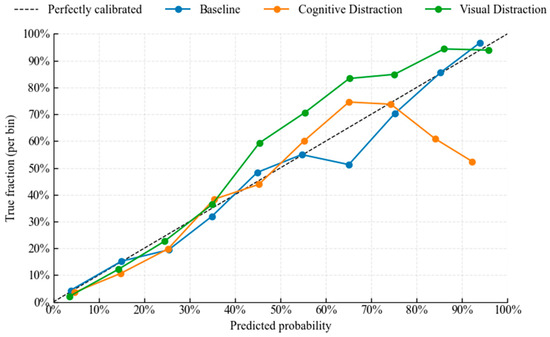 Calibration analysis (Figure 8) showed that predicted probabilities were generally well aligned with observed correctness. Visual distraction was best calibrated, while baseline and cognitive distraction showed mild overconfidence in the mid-probability range (40–70%), consistent with the confusion patterns. Moreover, the cognitive distraction curve dropped in the high-probability region (≥0.9), which can be attributed to the small number of highly confident predictions combined with the systematic confusion between baseline and cognitive distraction. This pattern is consistent with the confusion matrix results, highlighting that distinguishing between baseline and cognitive distraction remains more challenging, while visual distraction is more robustly detected.