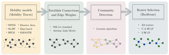 The proposed evaluation framework for the topology control mechanism is composed of four sequential stages: (1) selection of mobility models to simulate realistic node movement, (2) detection of community structure using the Louvain algorithm, (3) router selection based on centrality metrics within and across communities, and (4) establishment of connections and edge weights according to the IEEE 802.11s standard and the Airtime Link Metric. Each component plays a fundamental role in shaping the backbone network and evaluating its performance under different mobility scenarios. Figure 1 illustrates the overall process.